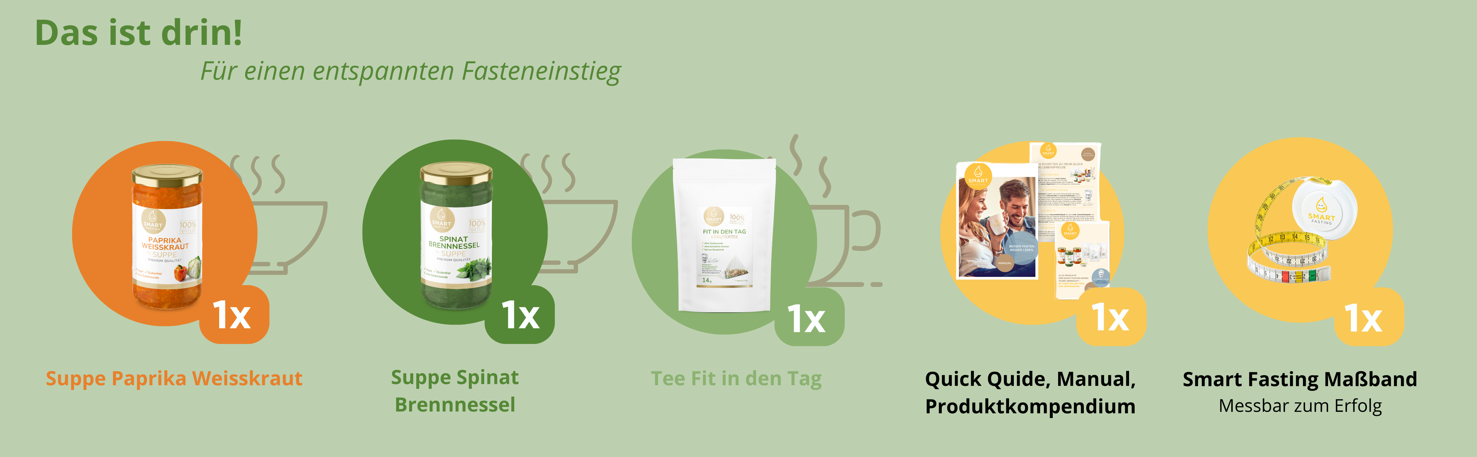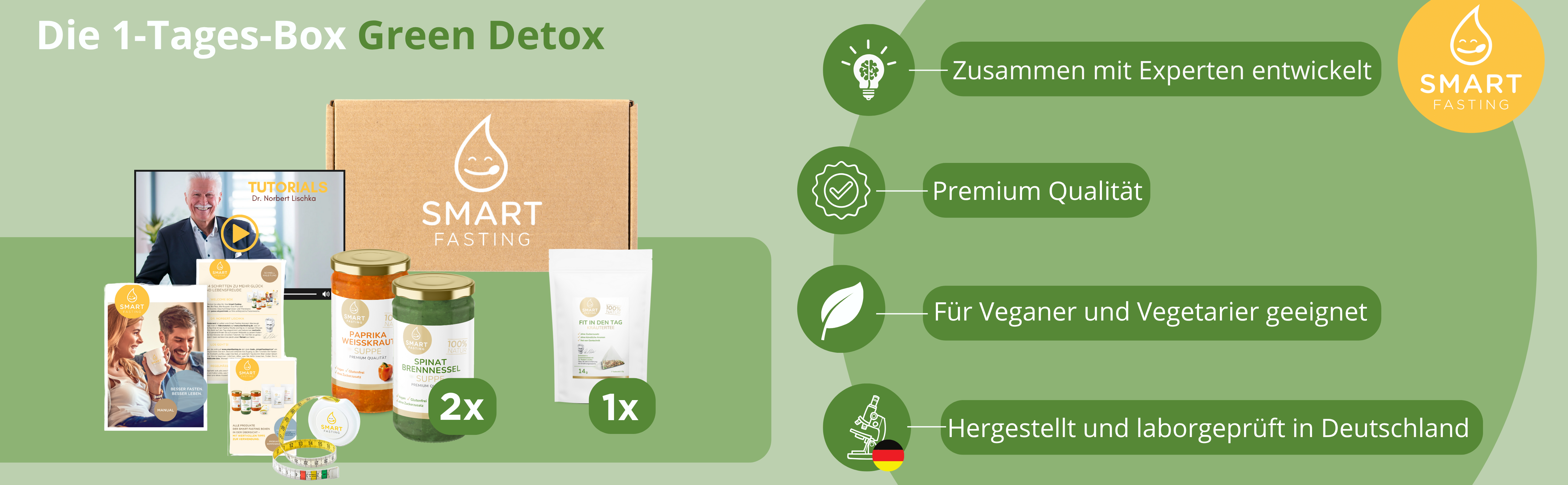 Die 1-Tages-Box Green Detox ist Ihr Einstieg in ein bewusstes Ernährungskonzept zu Hause. Anders als die flexibel konfigurierbare Variante bietet diese Box eine bereits abgestimmte Auswahl an wohltuenden Suppen und aromatischen Tees Entwickelt mit Fastenexperte Dr. Norbert Lischka, begleitet Sie das Konzept strukturiert durch einen bewusst nährstoffreduzierten Tag – mit Anleitung und klarem Leitfaden.