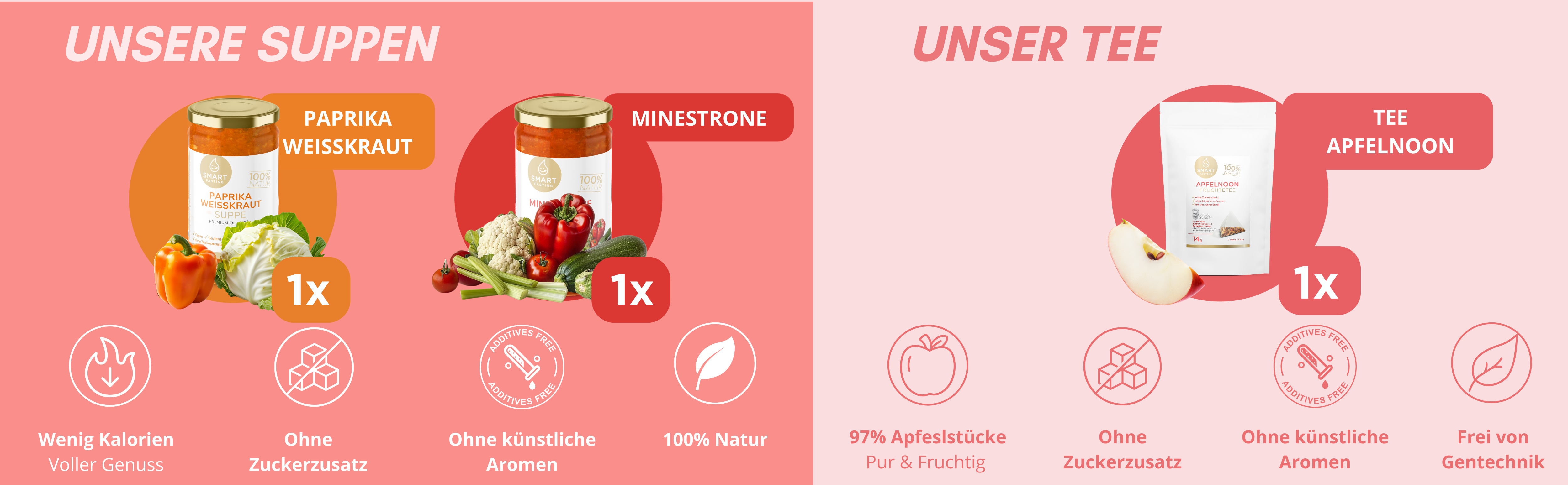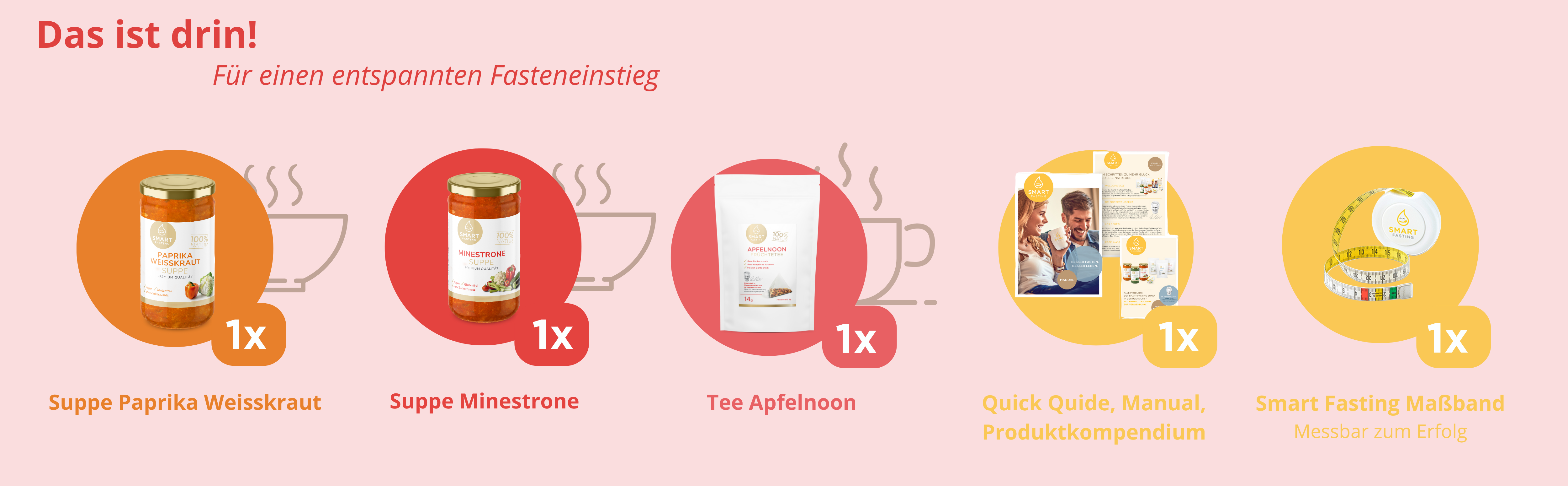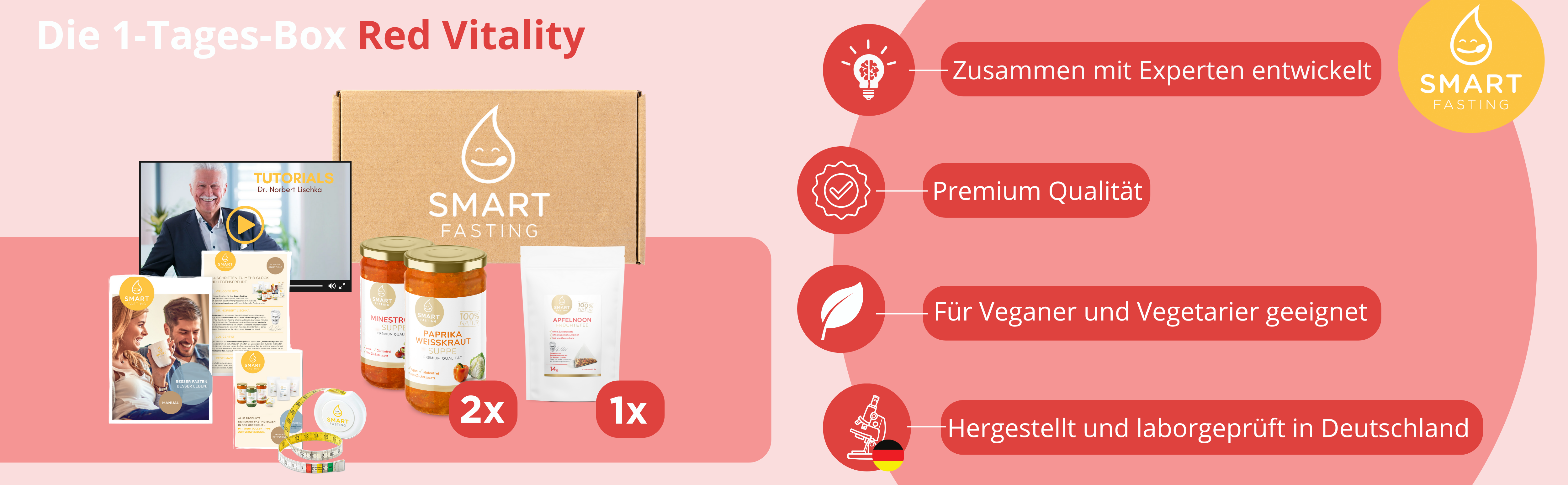 Die 1-Tages-Box Red Vitality ist Ihr Einstieg in ein bewusstes Ernährungskonzept zu Hause. Anders als die flexibel konfigurierbare Variante bietet diese Box eine bereits abgestimmte Auswahl an wohltuenden Suppen und aromatischen Tees. Entwickelt mit Fastenexperte Dr. Norbert Lischka, begleitet Sie das Konzept strukturiert durch einen bewusst nährstoffreduzierten Tag – mit Anleitung und klarem Leitfaden.