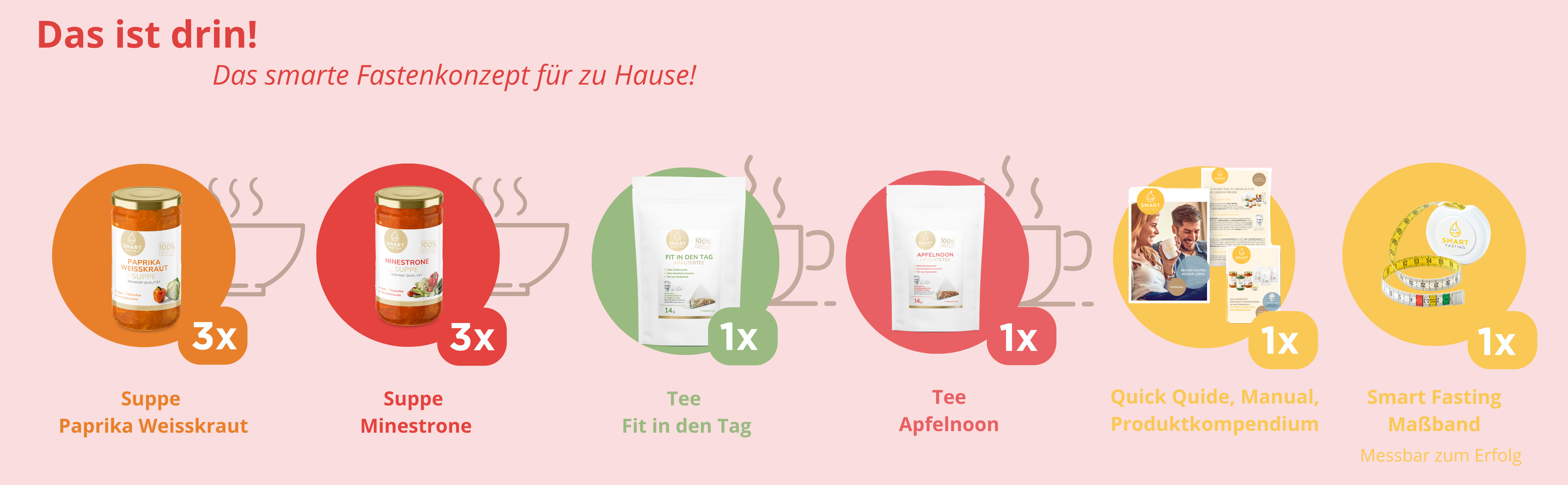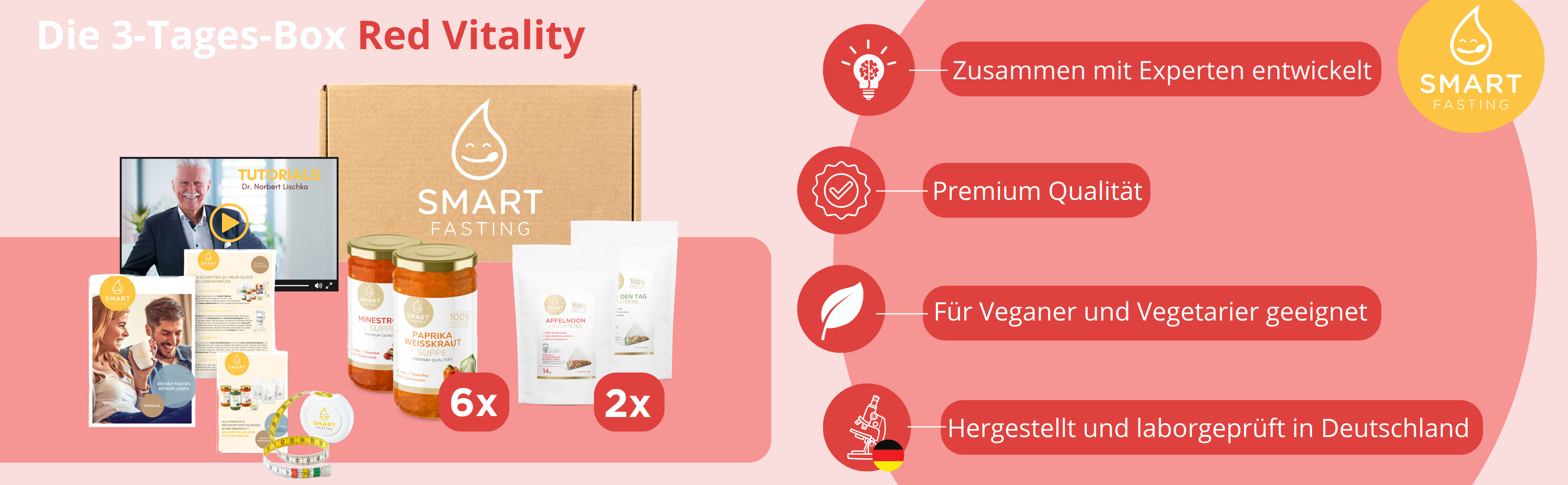 Die 3-Tages-Box Red Vitality ist Ihr bewusstes Ernährungskonzept zu Hause. Anders als die flexibel konfigurierbare Variante bietet diese Box eine bereits abgestimmte Auswahl an wohltuenden Suppen und aromatischen Tees. Entwickelt mit Fastenexperte Dr. Norbert Lischka, begleitet Sie das Konzept strukturiert durch fünf bewusst nährstoffreduzierte Tage – mit Anleitung, Maßband und klarem Leitfaden.