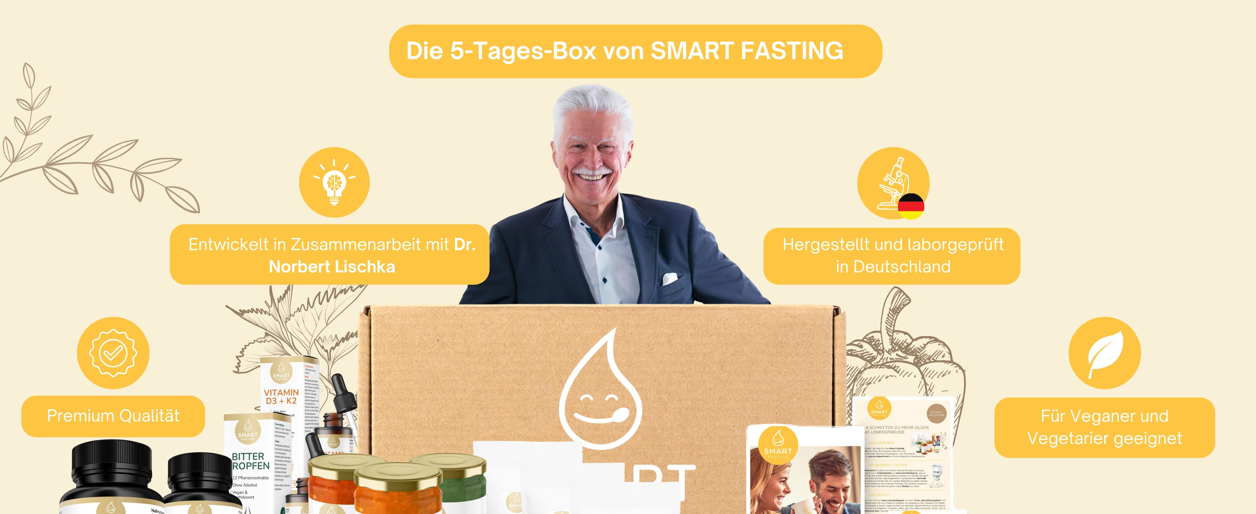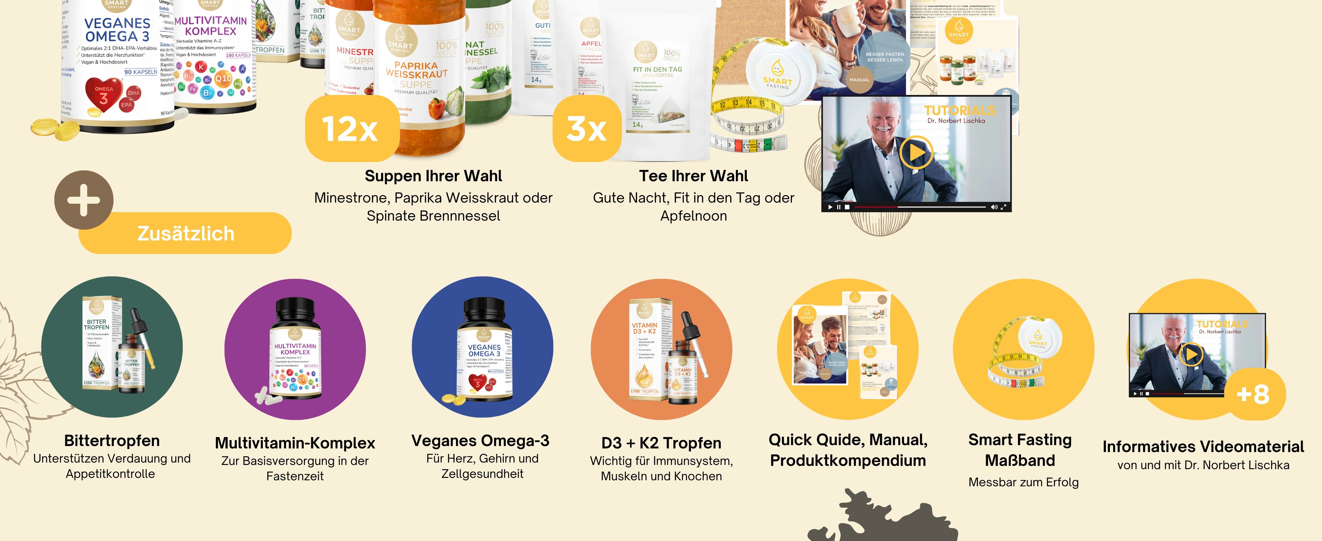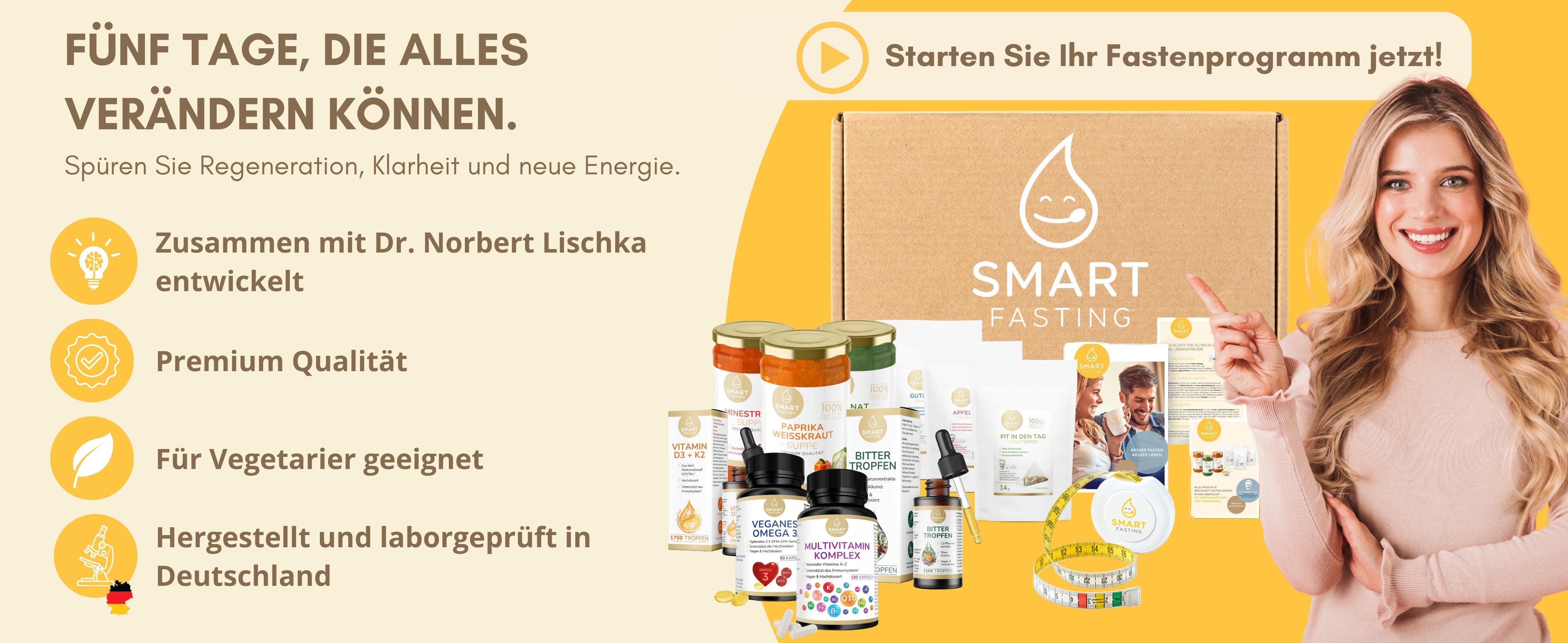 Die Smart Fasting 5-Tages-Box ist Ihr individuelles Fastenerlebnis für zu Hause. Wählen Sie Ihre Lieblingssuppen und passenden Tees ganz flexibel aus und stellen Sie sich Ihre Fastenbox selbst zusammen – abgestimmt auf Ihren Geschmack und Tagesrhythmus. Entwickelt mit Fastenexperte Dr. Norbert Lischka, begleitet Sie das Konzept strukturiert durch fünf bewusst nährstoffreduzierte Tage – mit Anleitung und klarem Leitfaden.