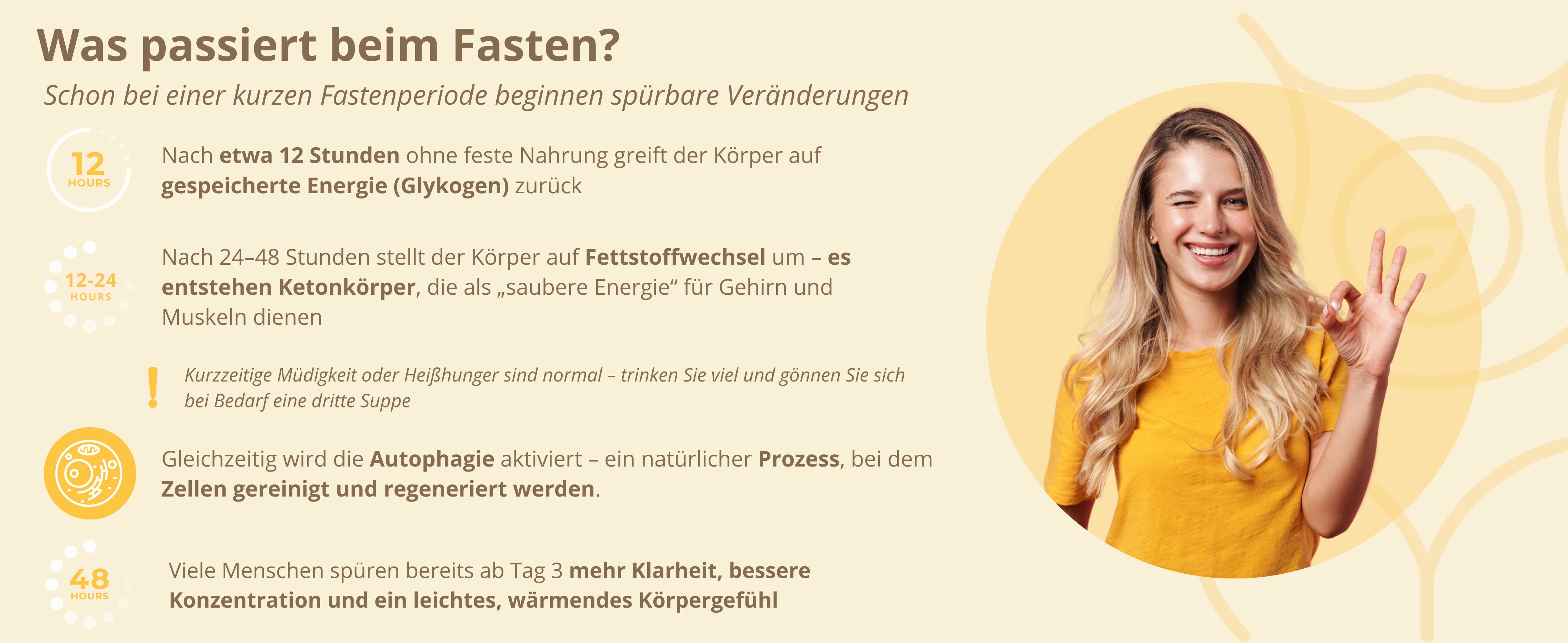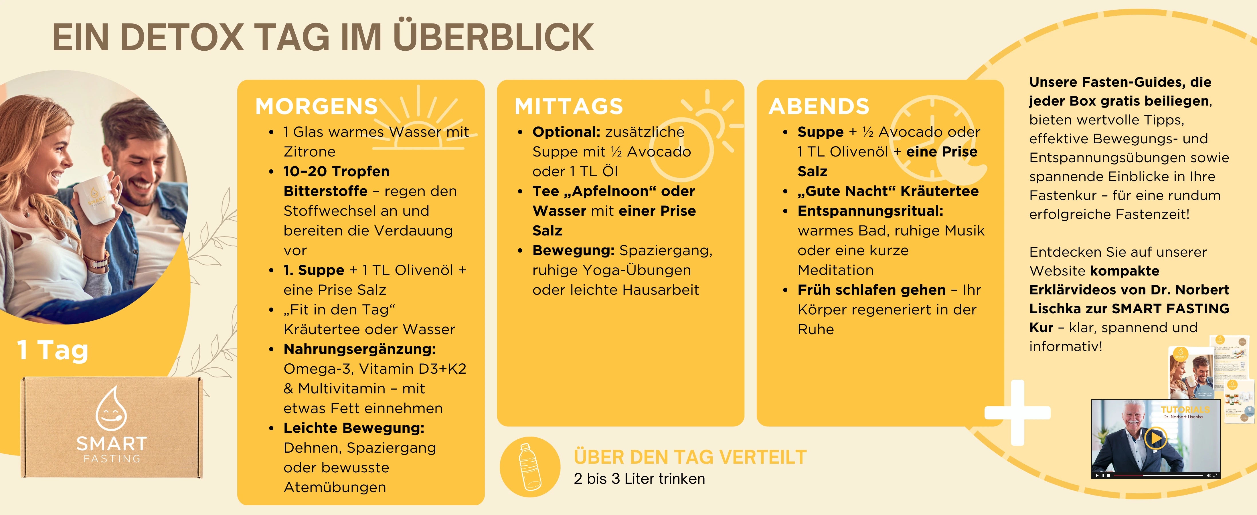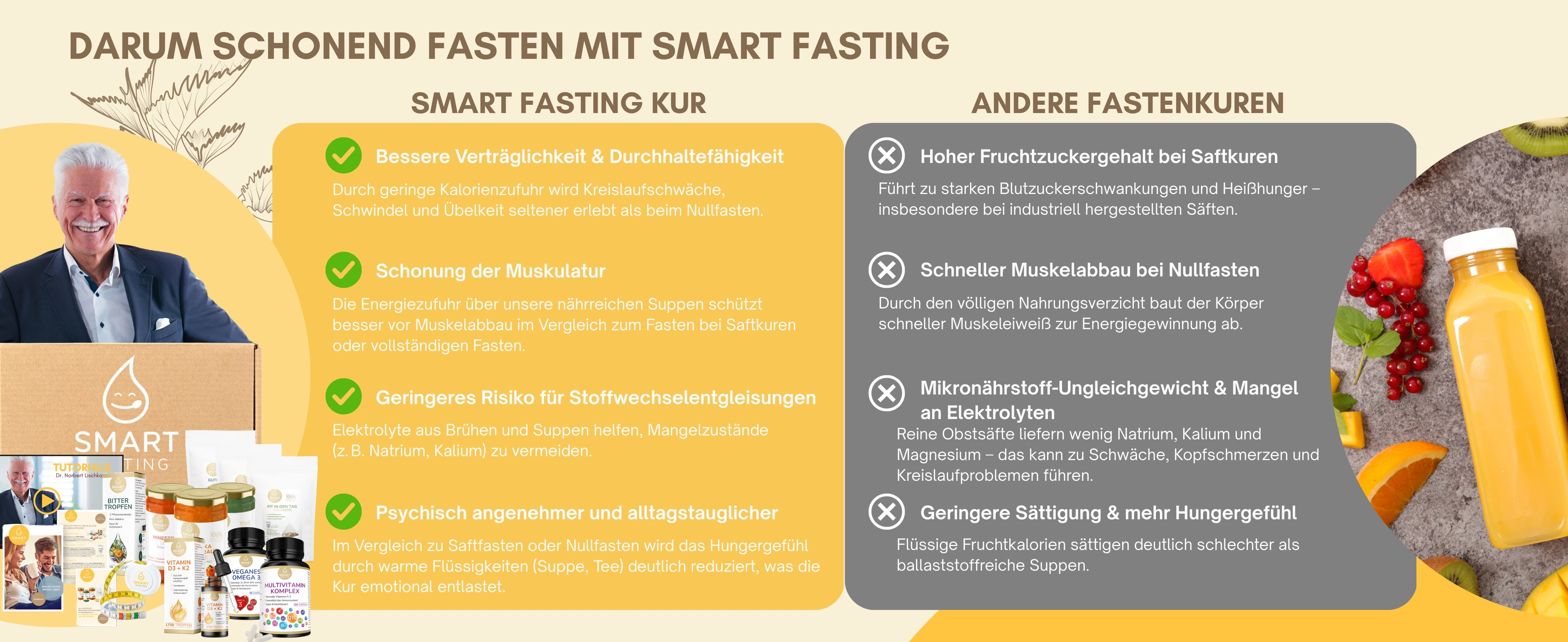 Die Smart Fasting 5-Tages-Box ist Ihr individuelles Fastenerlebnis für zu Hause. Wählen Sie Ihre Lieblingssuppen und passenden Tees ganz flexibel aus und stellen Sie sich Ihre Fastenbox selbst zusammen – abgestimmt auf Ihren Geschmack und Tagesrhythmus. Entwickelt mit Fastenexperte Dr. Norbert Lischka, begleitet Sie das Konzept strukturiert durch fünf bewusst nährstoffreduzierte Tage – mit Anleitung und klarem Leitfaden.
