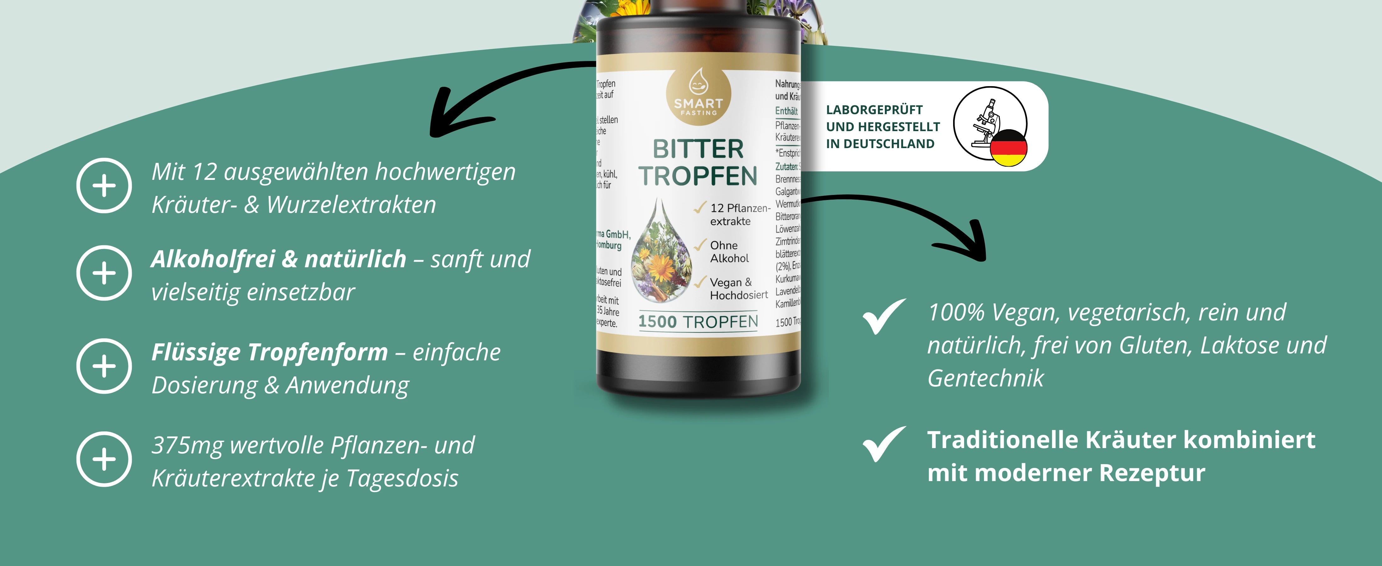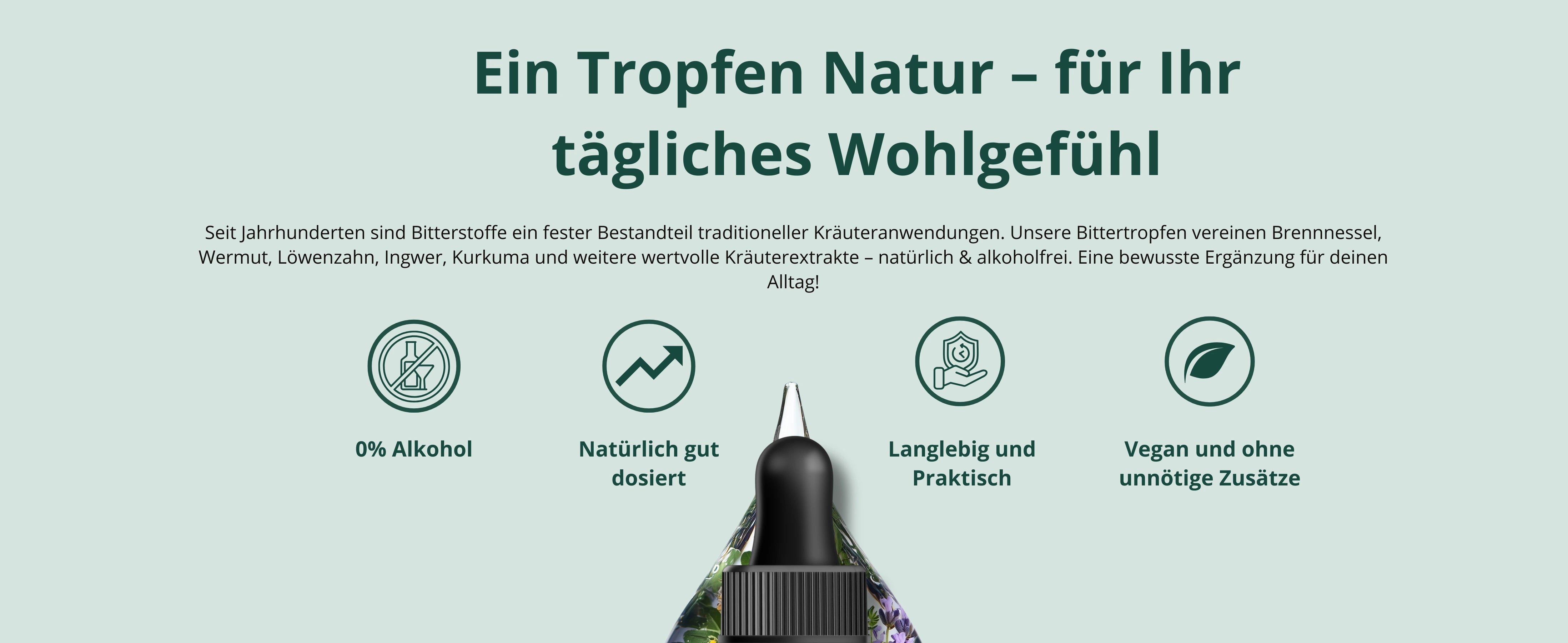 Unsere Bittertropfen vereinen 12 sorgfältig ausgewählte Pflanzenextrakte – darunter Artischocke, Löwenzahn, Enzian, Brennnessel und Galgant – in einer schonend verarbeiteten und alkoholfreien Rezeptur. Bitterstoffe wurden über Generationen hinweg als feste Bestandteile einer bewussten Ernährung geschätzt, besonders im Zusammenhang mit Mahlzeiten.