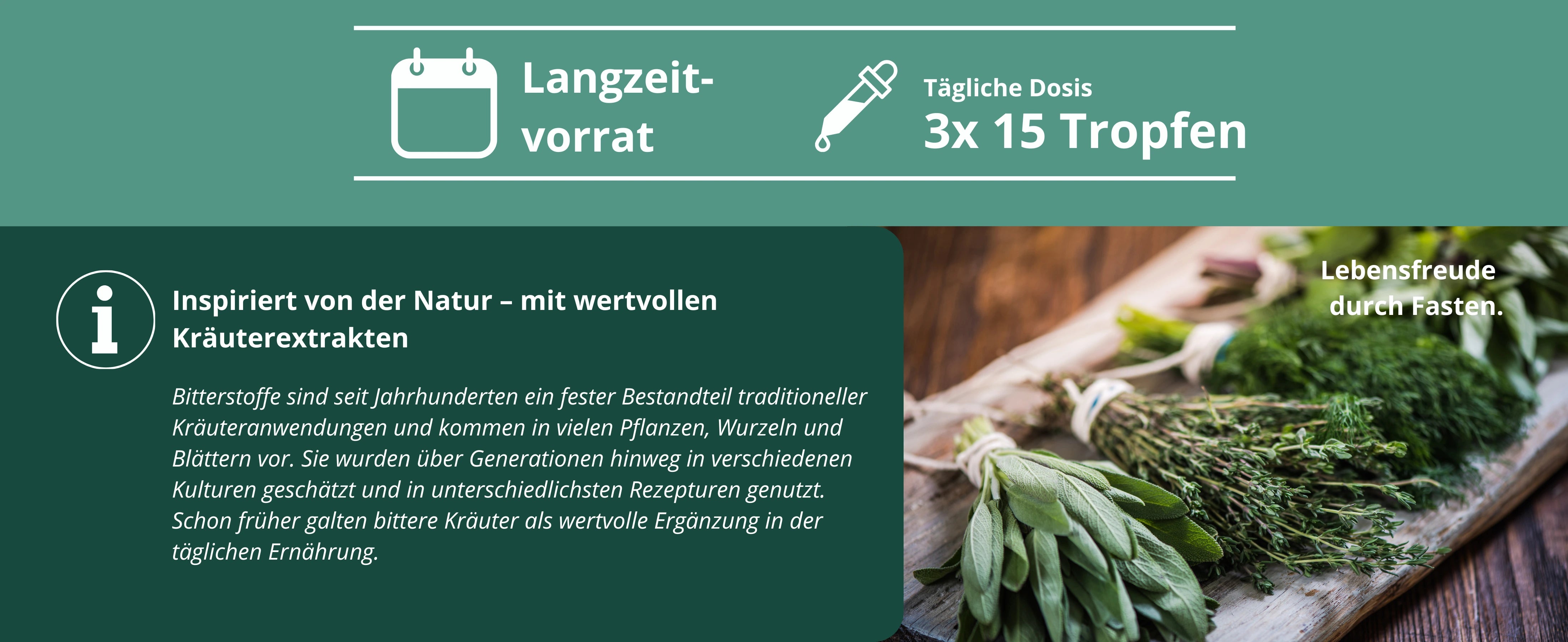 Nur 3× täglich 15 Tropfen – eine 50 ml-Flasche mit ca. 1500 Tropfen reicht für über einen Monat.