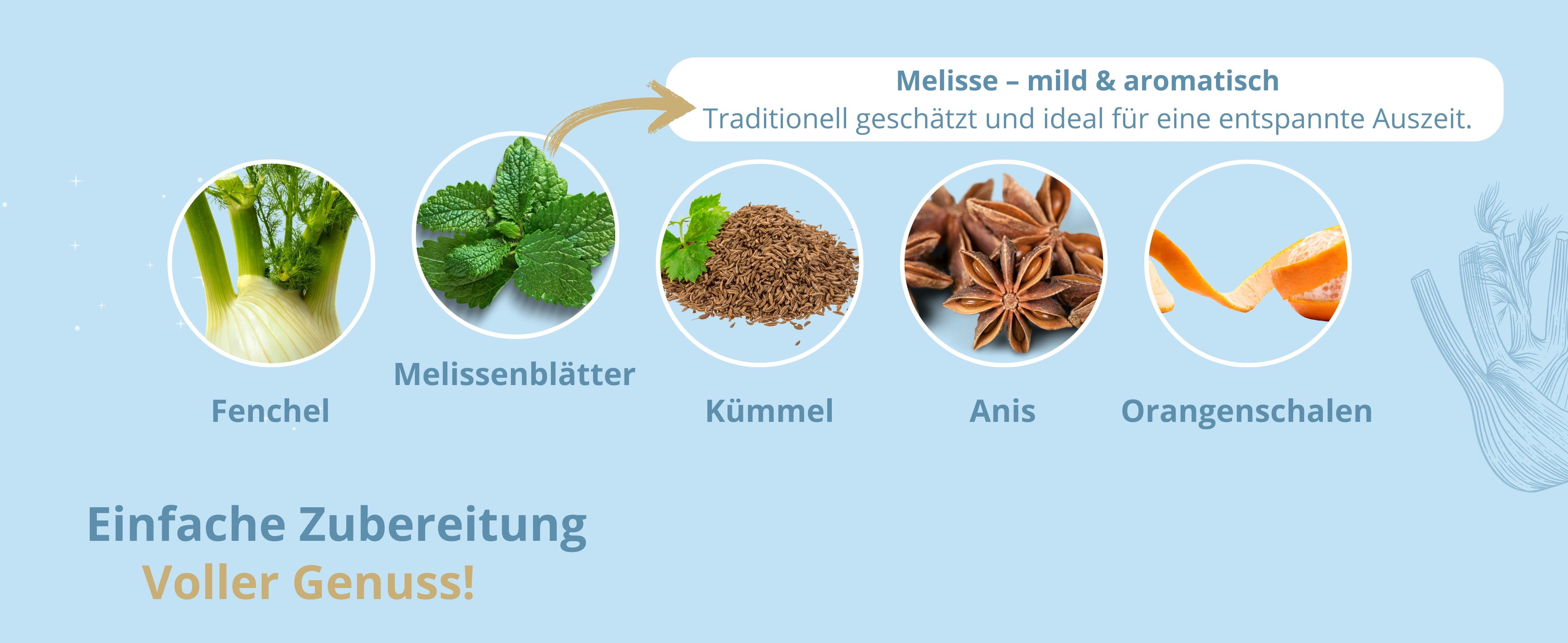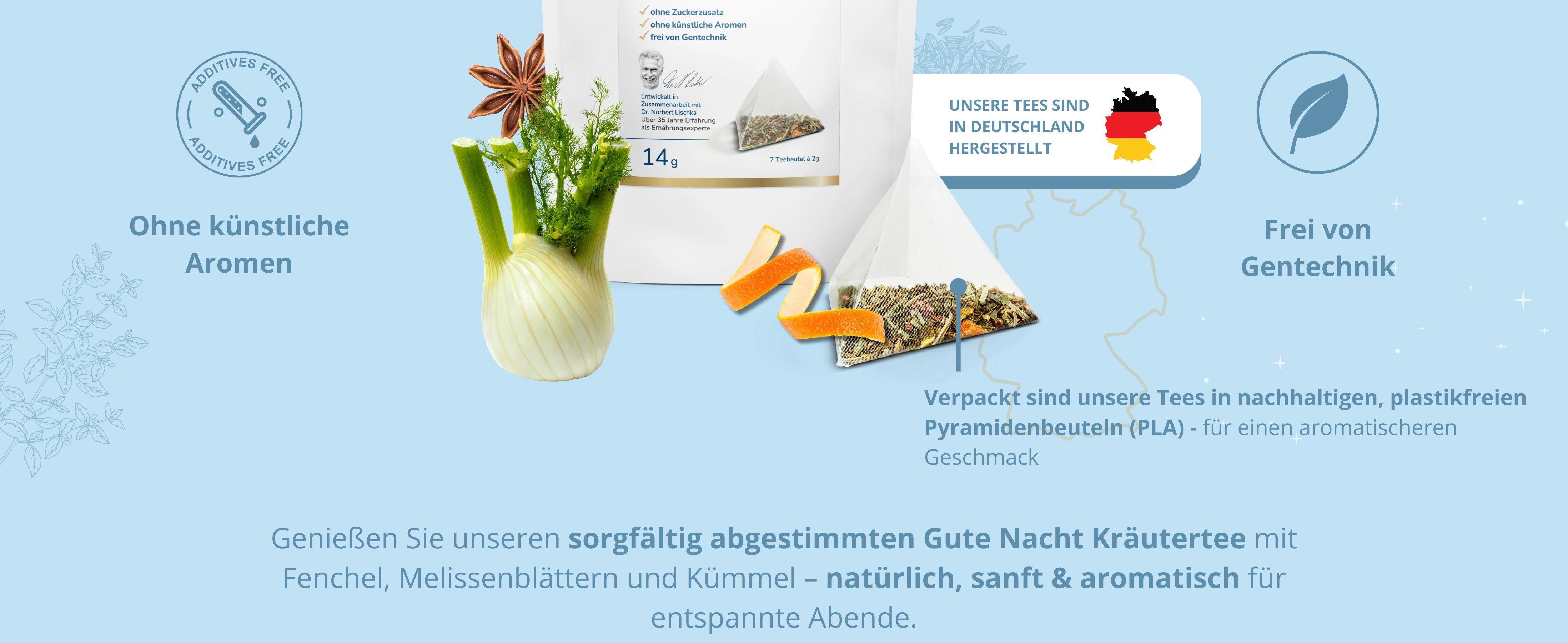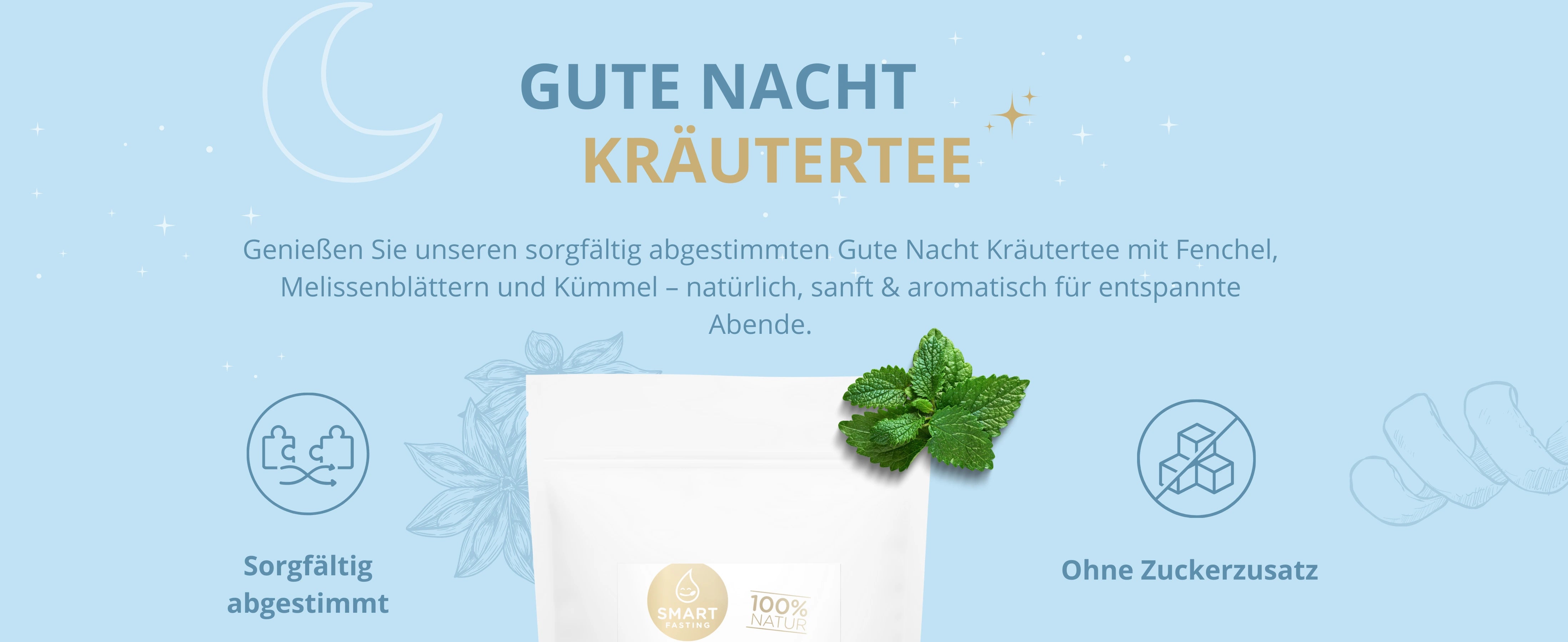 Unser Gute Nacht Kräutertee ist Ihr tägliches Abendritual – mit ausgewählten Zutaten wie Fenchel, Melissenblättern, Kümmel, Anis und Orangenschalen. Natürlich, ausgewogen und aromatisch für einen entspannten Ausklang Ihres Alltags oder zur Unterstützung während des Fastens.