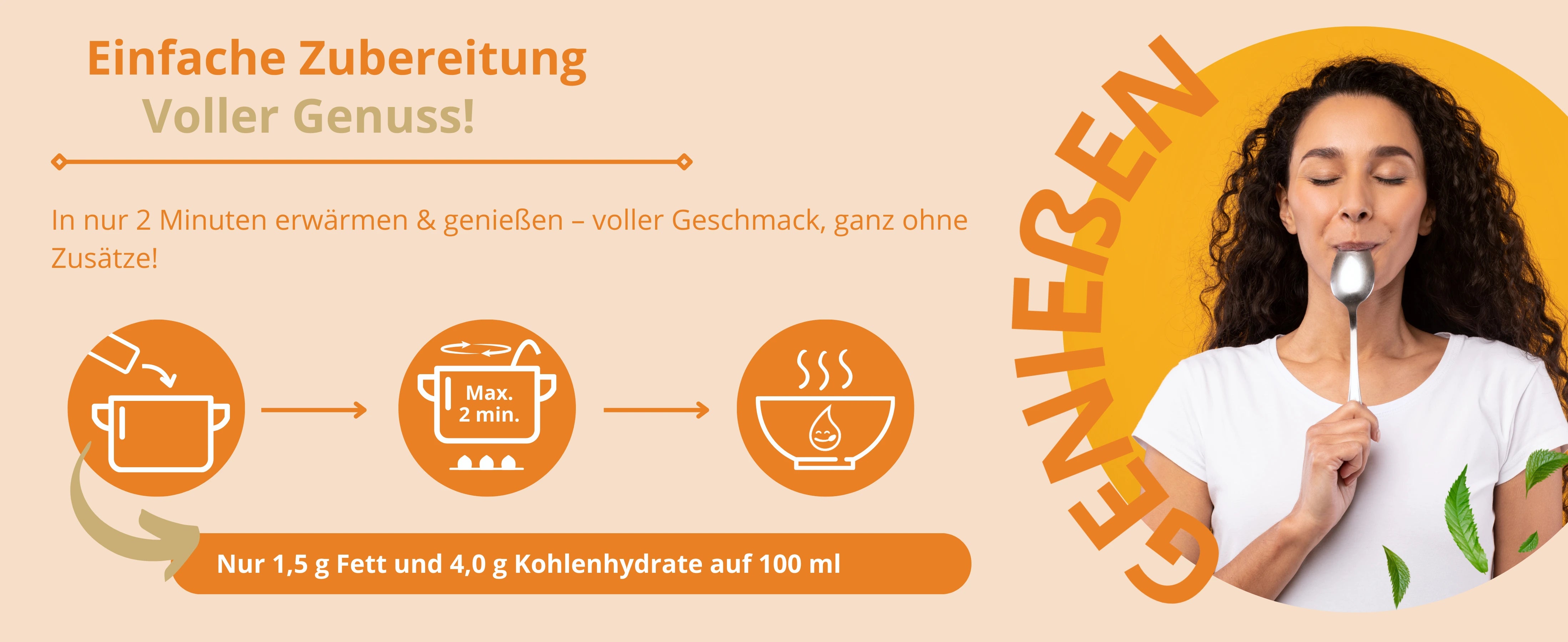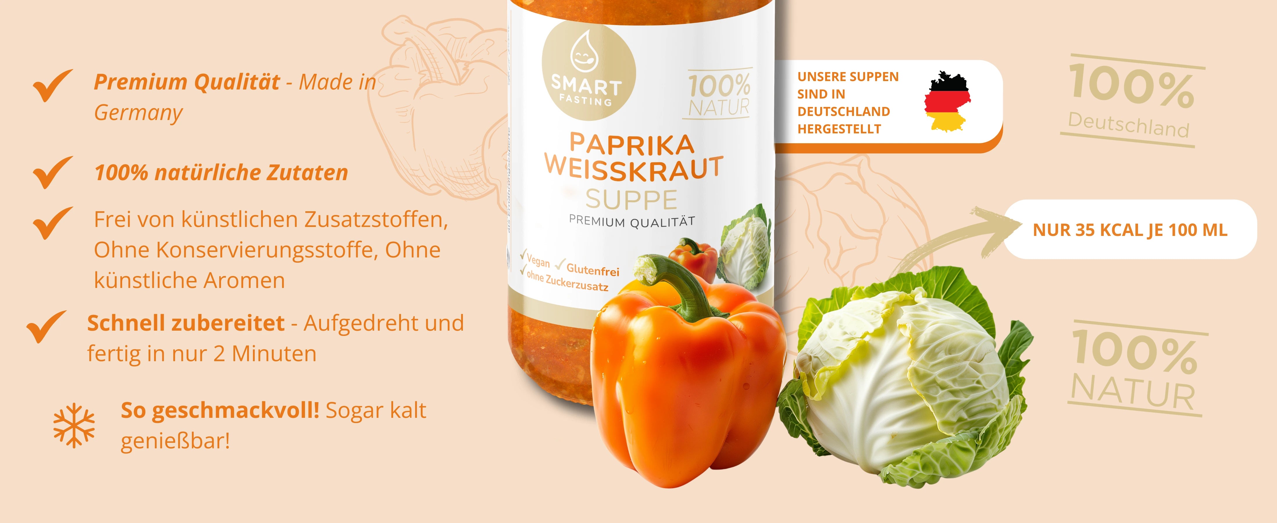 Unsere Smart Fasting Paprika-Weißkraut Suppen vereinen fein abgestimmte Gemüsesorten mit natürlichem Geschmack und einer klaren Rezeptur. Aromatische Paprika, zartes Weißkraut und ein Hauch Kokosmilch schaffen ein unverfälschtes Geschmackserlebnis – ganz ohne künstliche Zusätze. Ob als leichte Mahlzeit im Alltag oder als wärmender Begleiter während einer bewussten Ernährungspause: Diese Suppe ist in nur 2 Minuten bereit – purer Genuss ohne Aufwand.