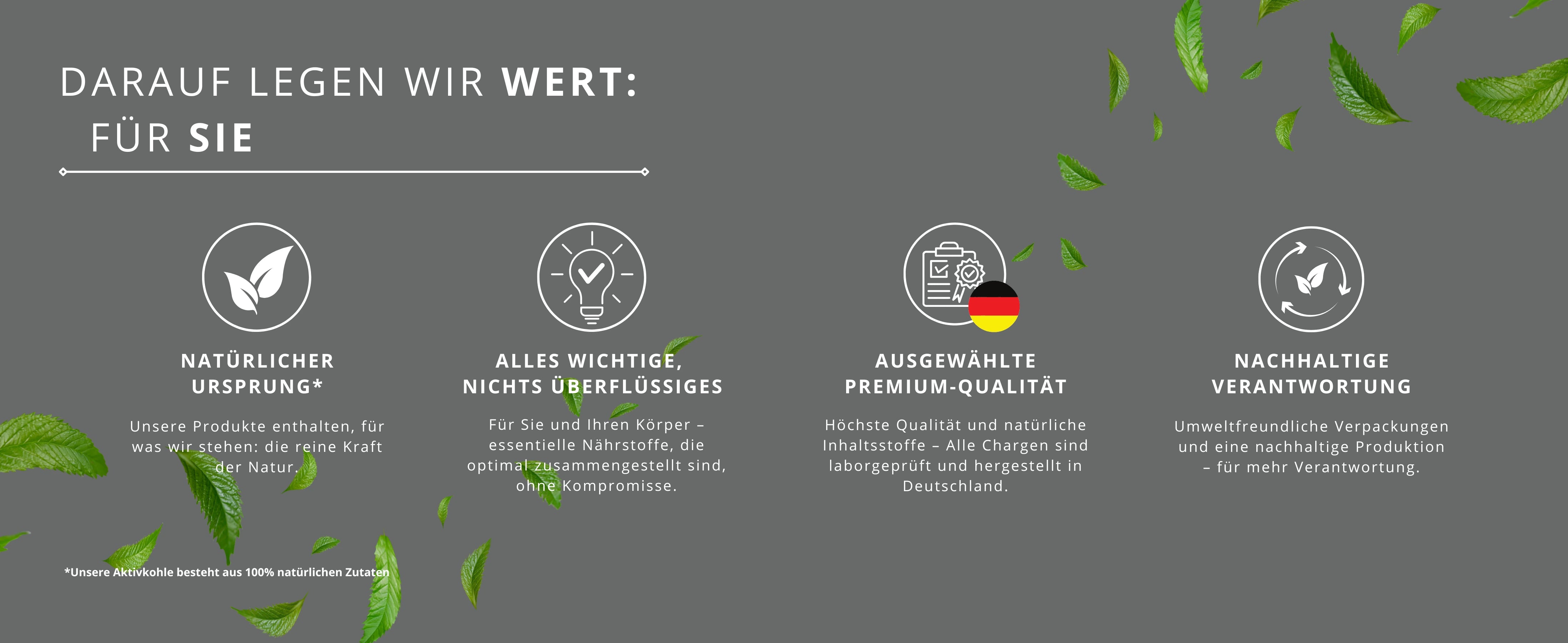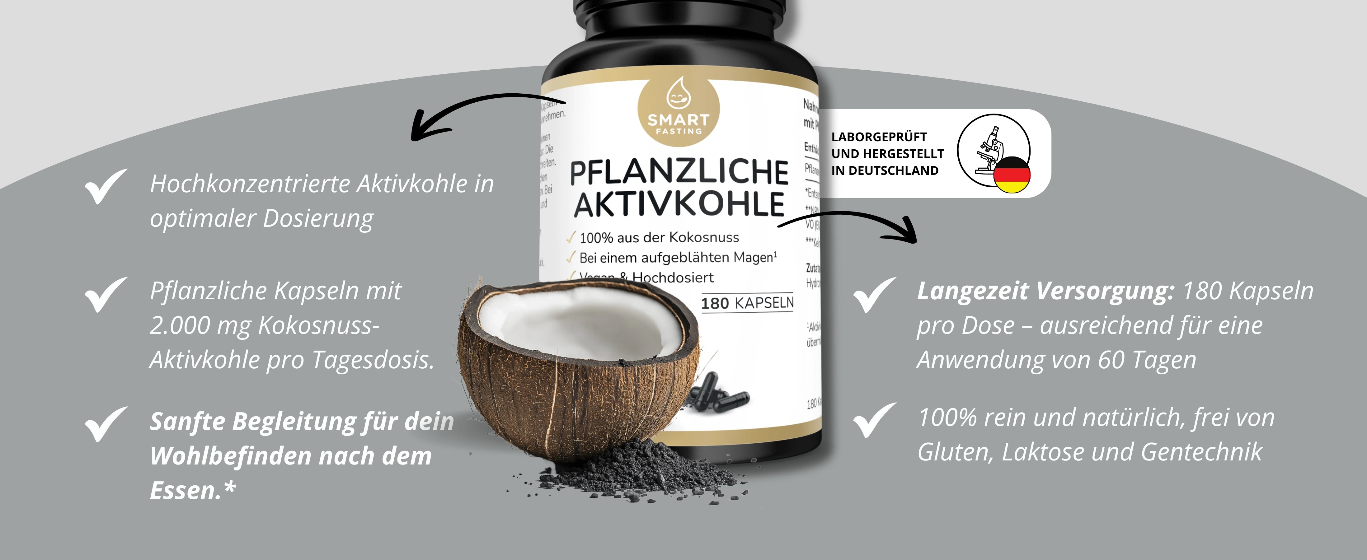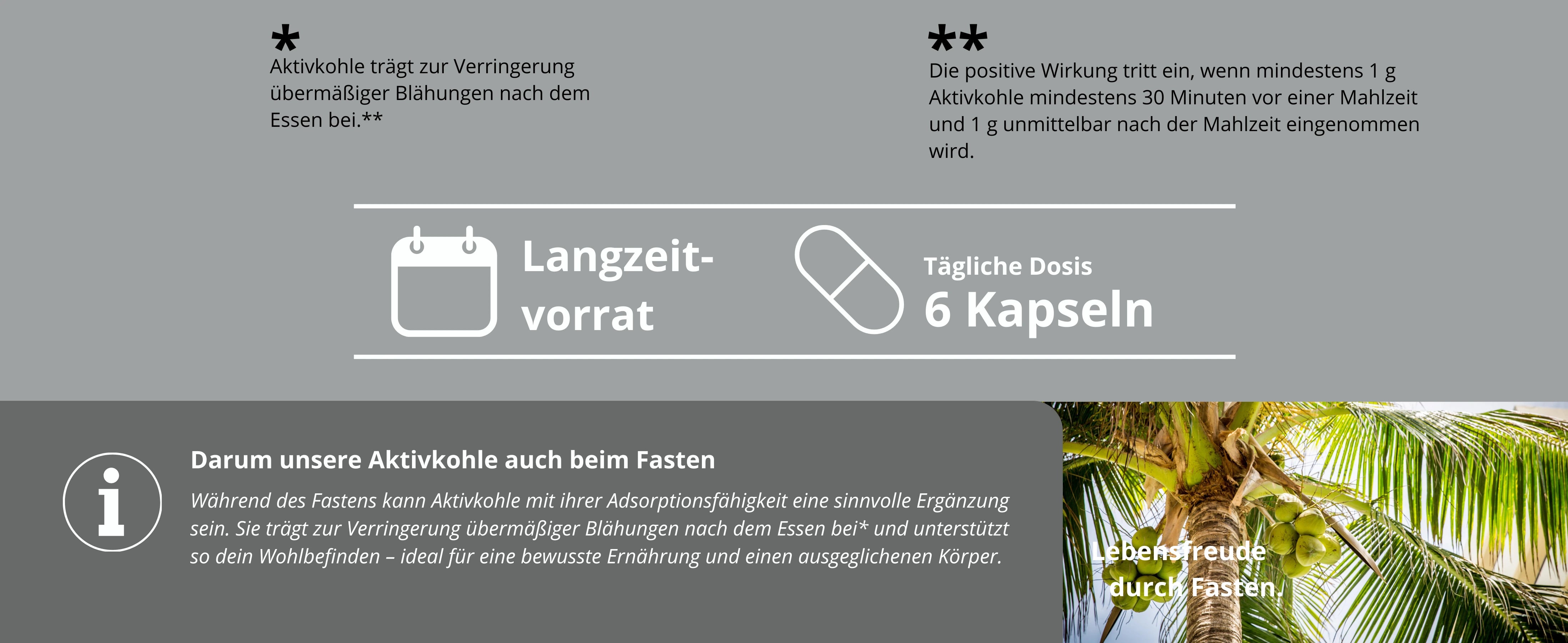 Unsere Aktivkohle Kapseln enthalten rein pflanzliche Aktivkohle – zu 100 % aus der Kokosnuss gewonnen. Durch ihre besonders feine, poröse Struktur besitzt sie eine große innere Oberfläche – ein Qualitätsmerkmal für hochwertige Aktivkohleprodukte. Die Einnahme von mindestens 1 g vor und 1 g nach einer Mahlzeit kann zur Verringerung übermäßiger Blähungen nach dem Essen beitragen. Die positive Wirkung stellt sich ein, wenn mindestens 1 g Aktivkohle mindestens 30 Minuten vor und 1 g kurz nach der Mahlzeit eingenommen wird.*