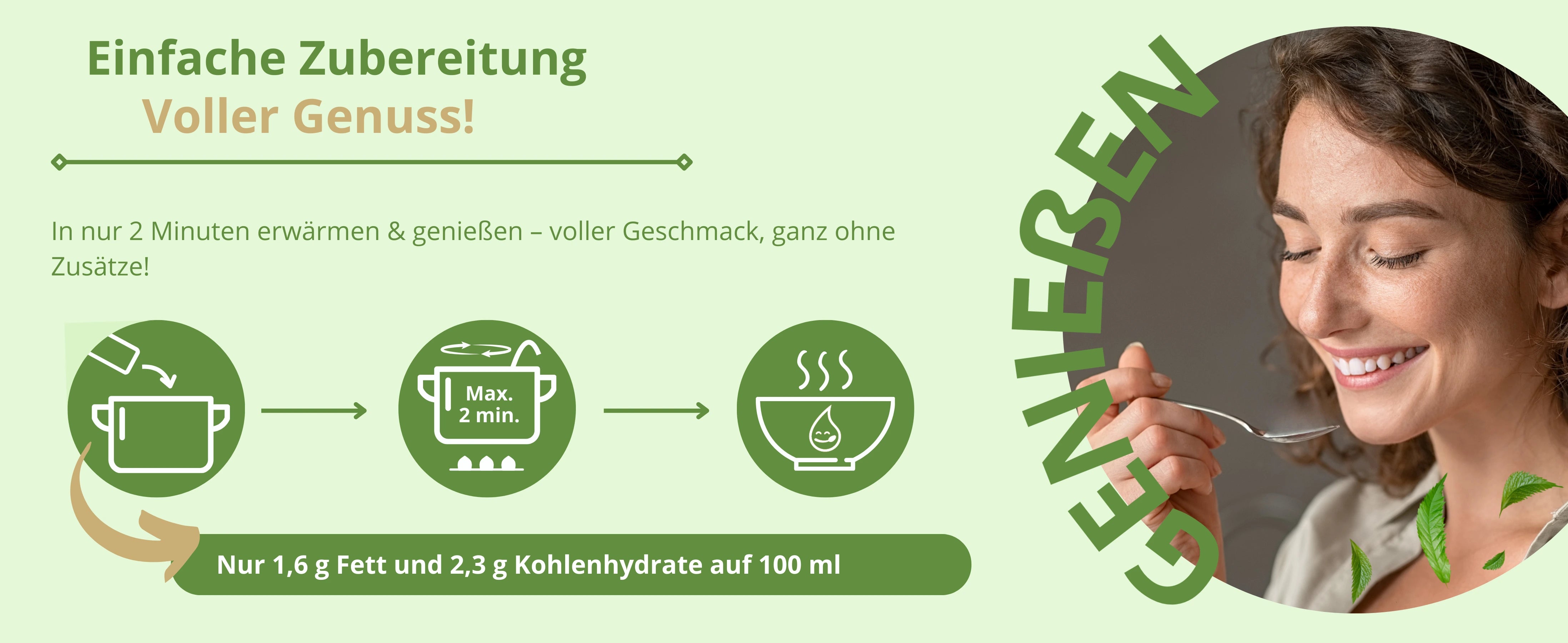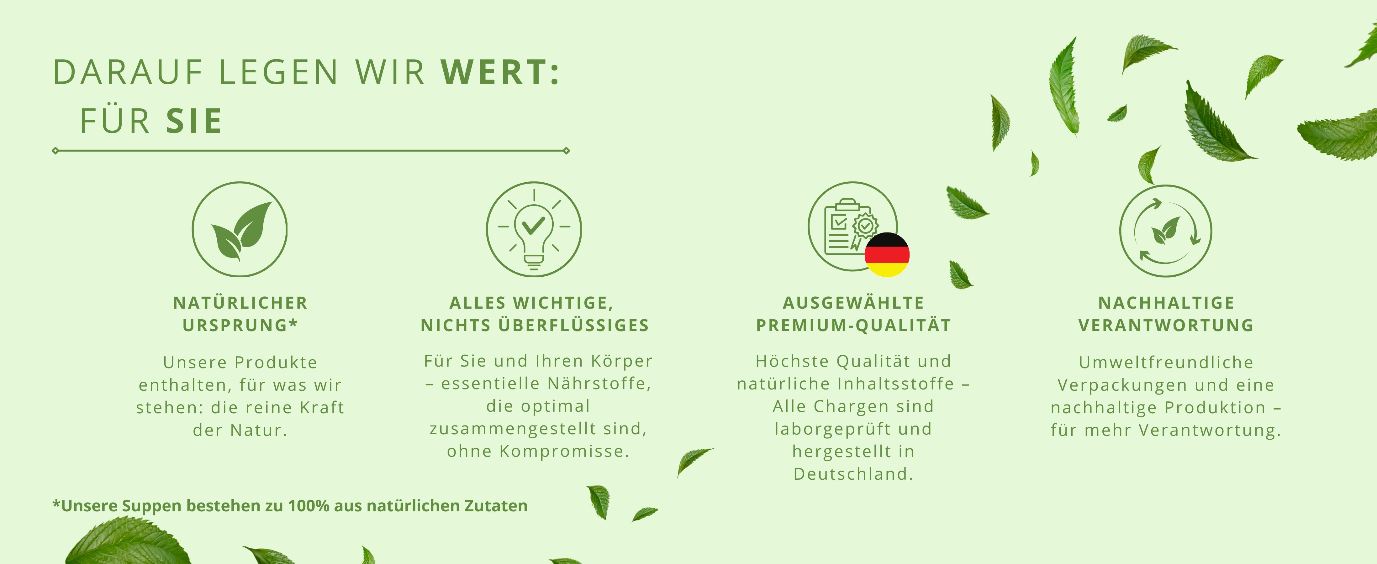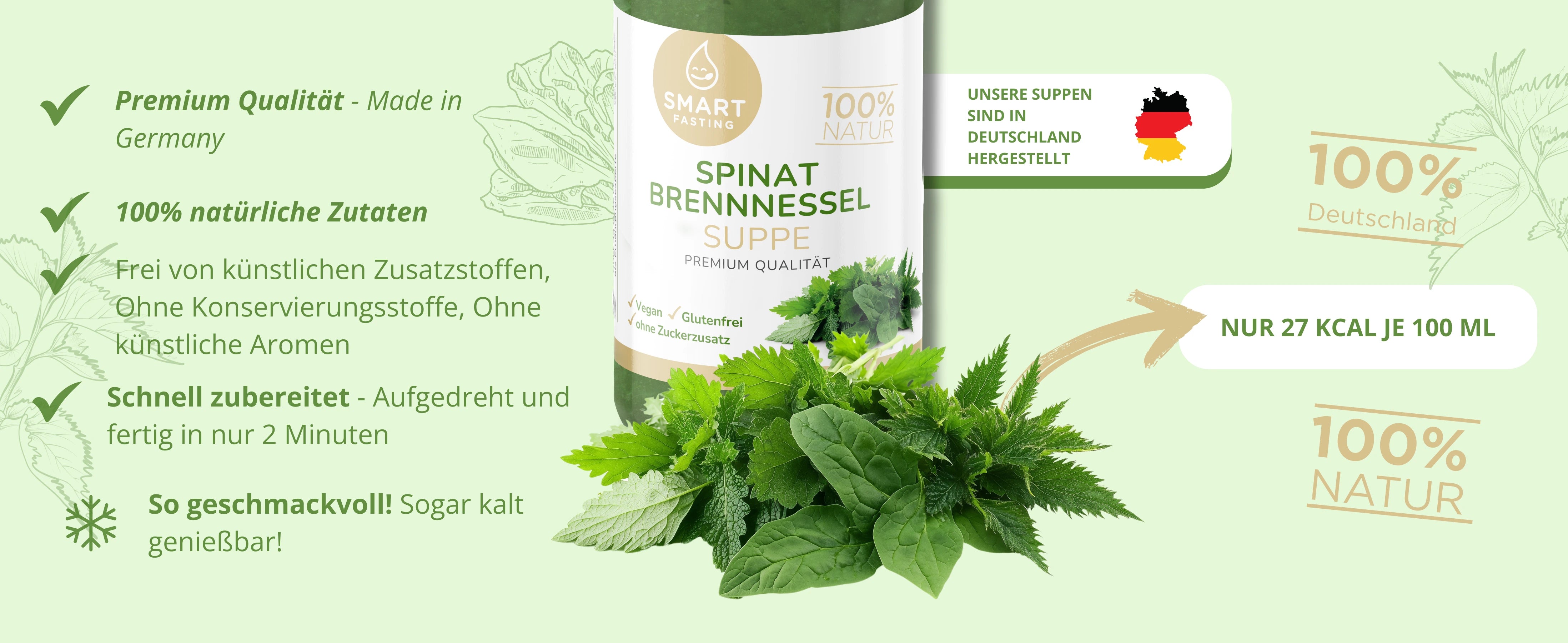 Unsere Smart Fasting Spinat-Brennnessel Suppen sind eine vegane, rein natürliche Gemüsekomposition mit bewusst ausgewählten Zutaten. Feiner Blattspinat trifft auf wilde Brennnessel, Ingwer und Kokosmilch – für ein leichtes, grünes Geschmackserlebnis. Ob als Teil einer bewussten Ernährung, während des Fastens oder einfach für den Alltag: Diese Suppe wärmt, belebt und ist in nur 2 Minuten servierfertig.